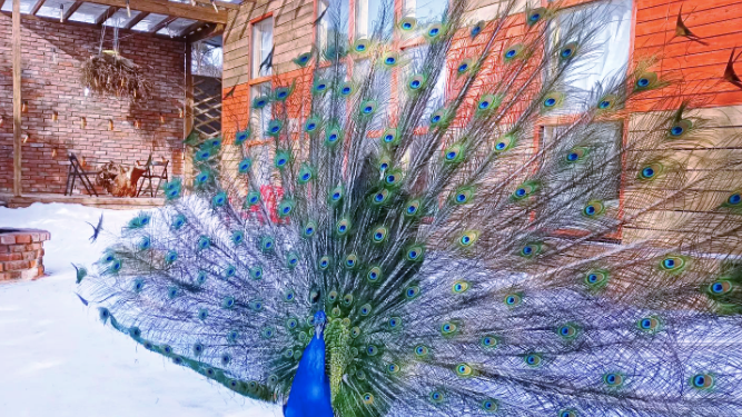 Во дворе днем при хорошей погоде гуляют павлины. Они свободно перемещаются по территории, общаются с гостями и создают волшебную атмосферу.